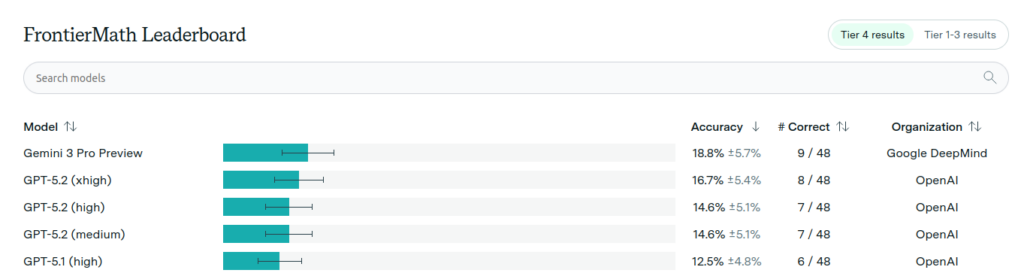 How are the AI models doing on these problems? Surely tier 4 is out of reach? Nope! Here is the leaderboard for tier 4: