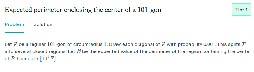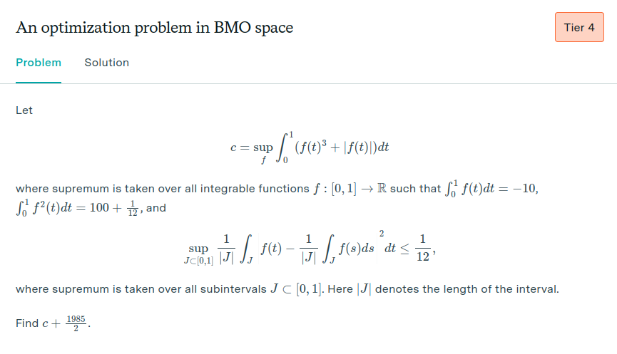 FrontierMath is the current end boss of math problems for AI. The problems are organized into four tiers. Tier 1 is supposed to be roughly equivalent to international mathematics olympiad problems (i.e. really hard, can take hours to solve or sometimes stump even the very top young math talent), and tier 4 is supposed to represent research-level problems that might take a week to solve for a professional math researcher with all available tools at their disposal. Here is a sample tier 1 problem: